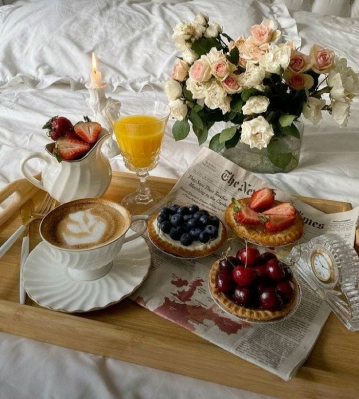 Buy the weekend paper and plan a fancy breakfast in bed. Pick wildflowers, make crepes or buy pastries, squeeze fresh orange juice, and drink coffee from a teacup on a silver platter. Romanticise your own life.