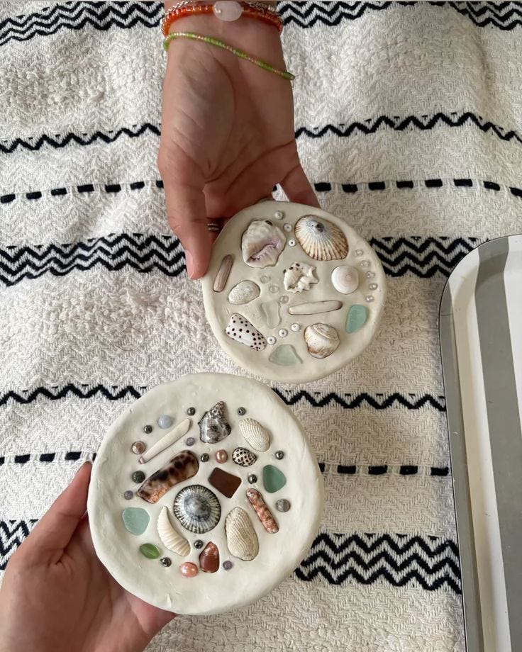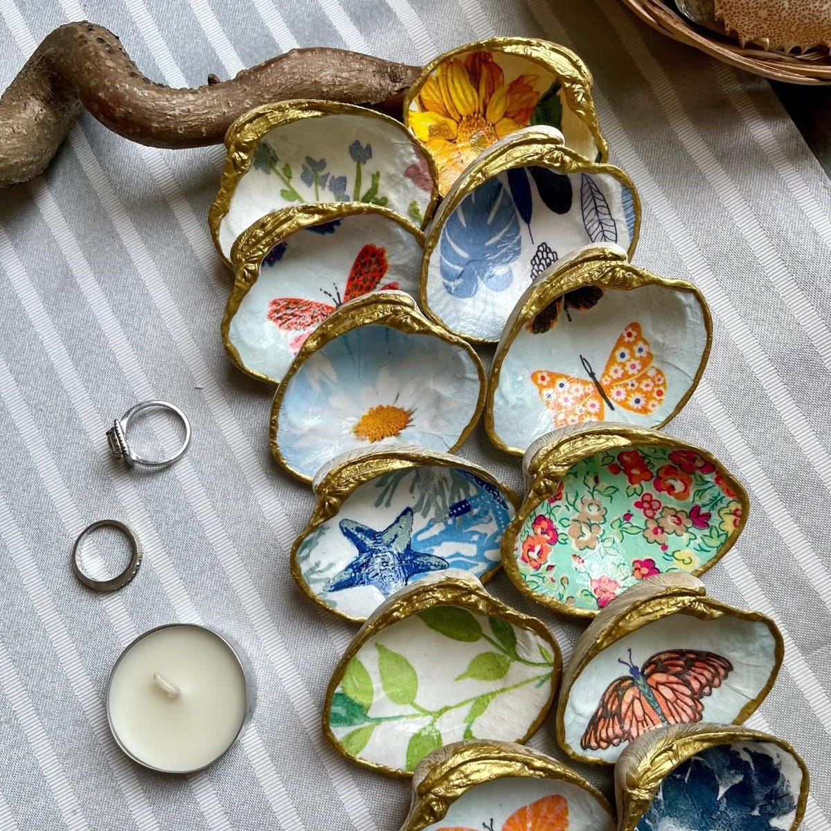 Collect a few old shells and decoupage them with tissue paper. Line the edges with a gold marker and turn them into tiny trinket holders for rings, matches, or little affirmations you want to remind yourself of.