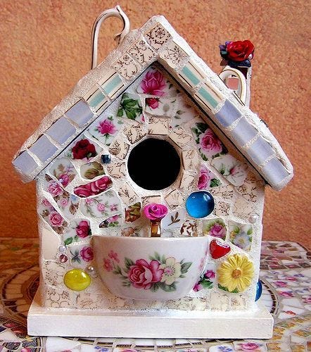 Smash up old china plates from FB Marketplace or thrift stores and make the most whimsical bird house on your street. This is a great article that takes you through every step. I’m obsessed!